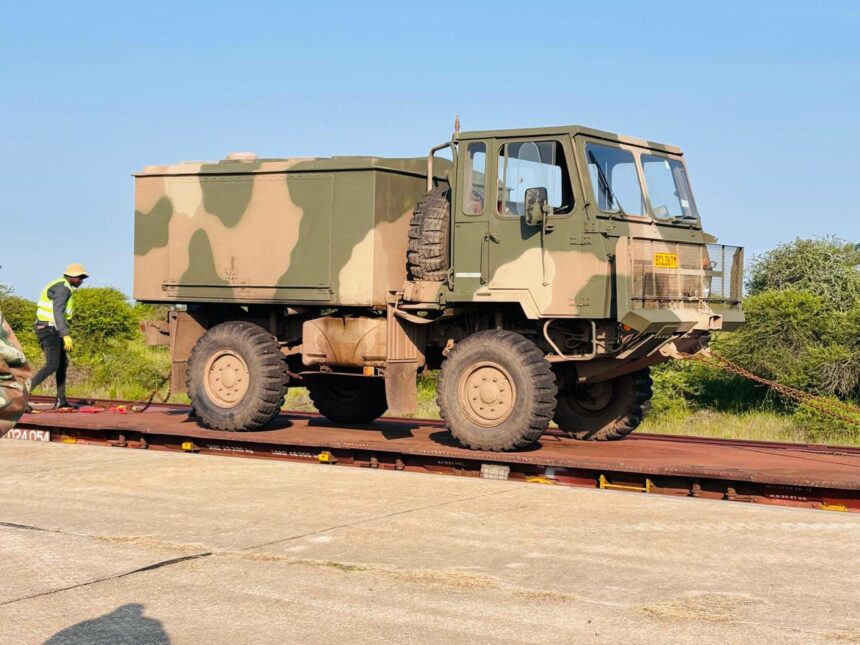 L’équipe de préparation des forces, avec sa composante logistique intégrale, a vu un train déplacer du matériel de mission principal, notamment des véhicules blindés de transport de troupes Mamba et Casspir et des camions Samil, depuis un point de départ non identifié – probablement le centre d’entraînement au combat du Cap Nord à Lohathla – jusqu’à la base aérienne (AFB) de Makhado, dans le Limpopo. De la « ville des combattants », l’équipement parcourra environ 90 km par la route jusqu’à Thohoyandou, lieu de la Journée des forces armées 2026.